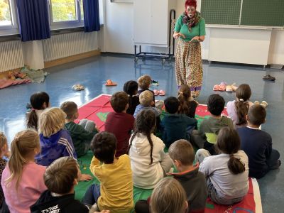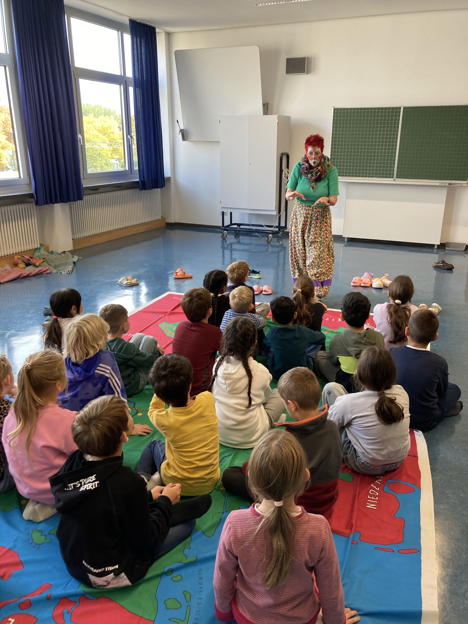 Am 08.10.2025 hatten die Kinder der dritten Klassen einen besonderen Gast: die Umweltclownin Ina Hansen ging mit ihnen auf eine Zeitreise bis zurück zu den Dinosauriern. Mit Hilfe eines übergroßen Puzzles, das ihre Ausführungen veranschaulichte, erfuhren die Kinder spielerisch, wie Erdöl und Erdgas entstanden sind. Auf einer Riesenlandkarte von Deutschland durften die Schülerinnen und Schüler dann den Transportweg von der Nordsee bis nach Bayern nachgehen.