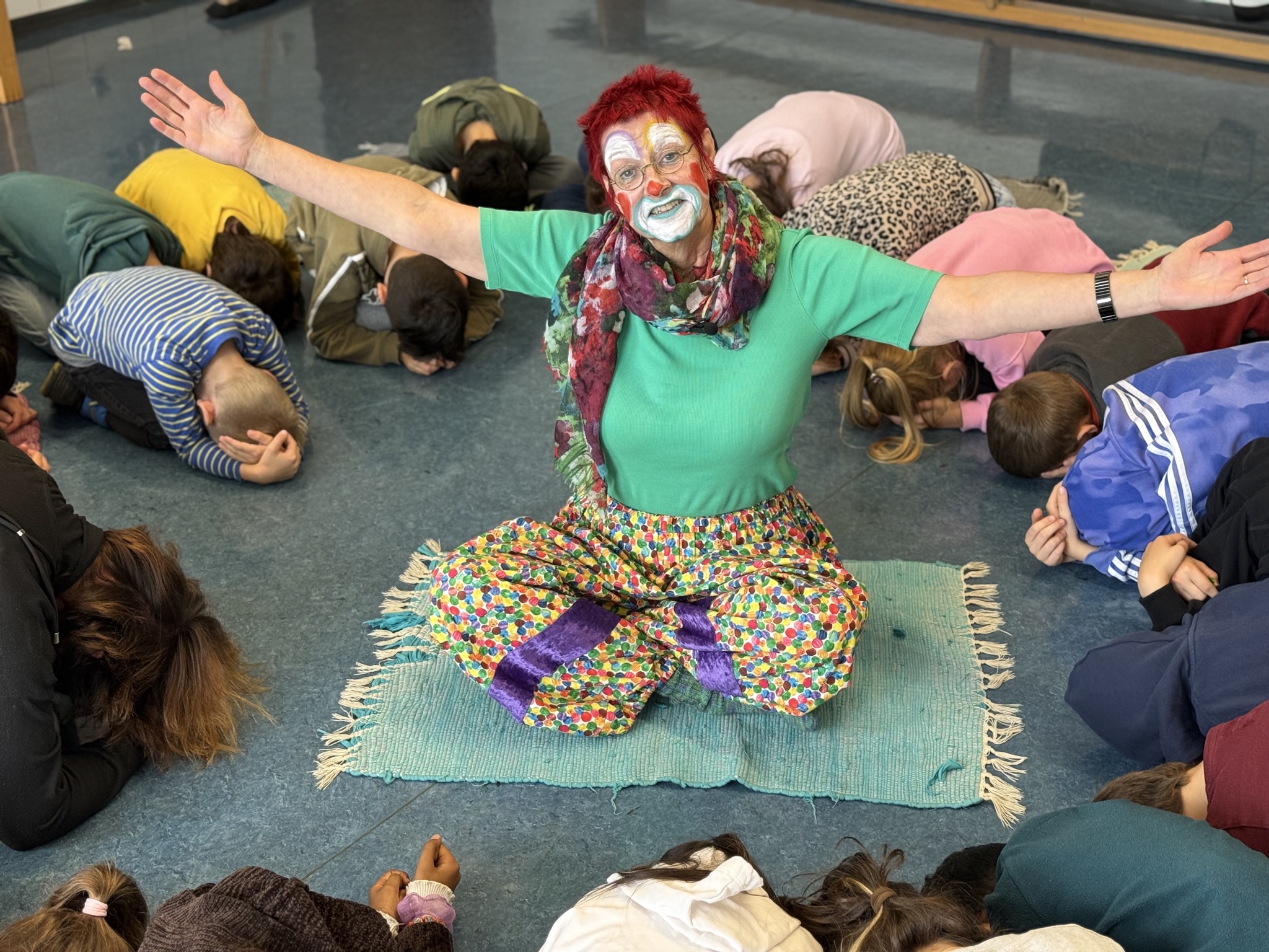 Am 08.10.2025 hatten die Kinder der dritten Klassen einen besonderen Gast: die Umweltclownin Ina Hansen ging mit ihnen auf eine Zeitreise bis zurück zu den Dinosauriern.